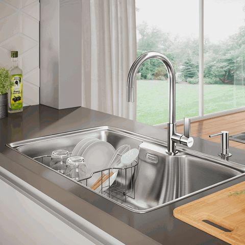 Além disso, a Cuba Bell Franke acompanha acessórios como: Tábua de Madeira, Cesto Aramado e Dosador de Sabão. Tudo para deixar sua cozinha ainda mais charmosa e moderna! 😍