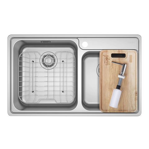 - Acessórios Originais Franke: encaixam perfeitamente na cuba, incluindo Tábua de Madeira, Cesto Aramado e Dosador de Sabão. 🍽️