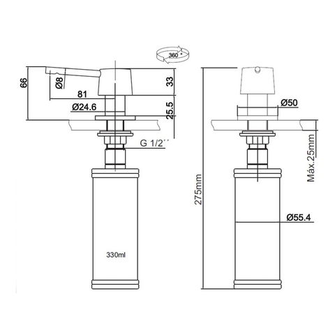 - Capacidade de 330ml: quantidade ideal para armazenar detergente ou sabonete líquido sem ocupar muito espaço.